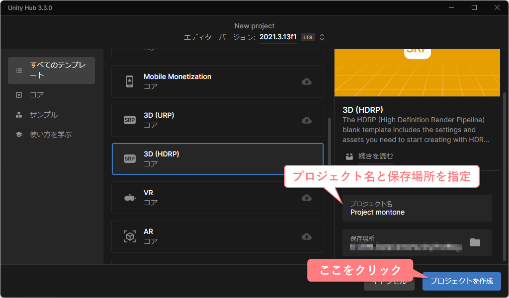実際にプロジェクトを作成していきましょう。リストの中から3D (HDRP)を選択して、右側に表示されるテンプレートをダウンロードをクリックします。